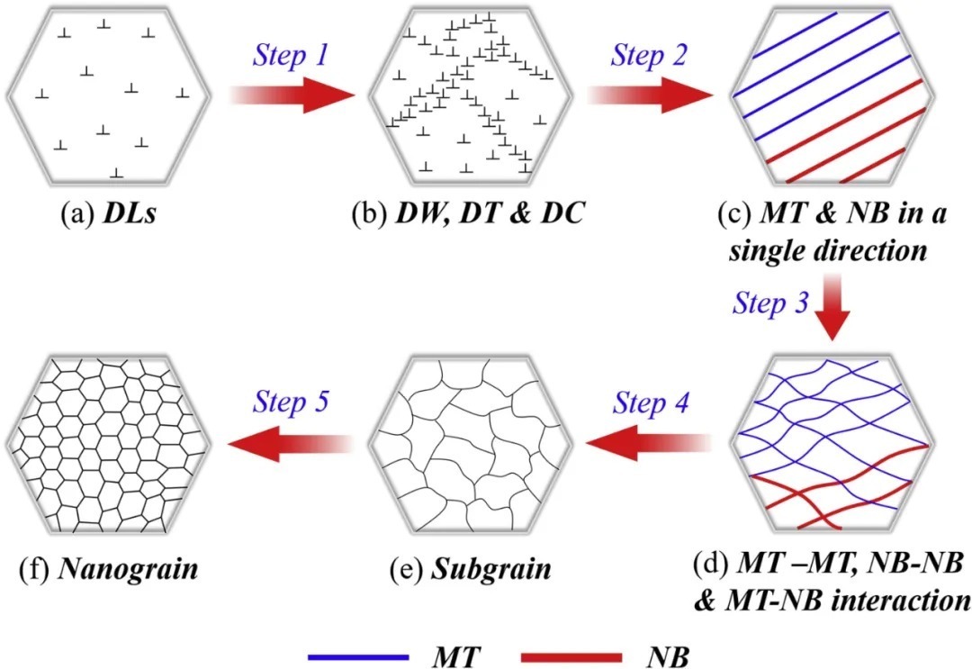 ▲图2.?激光冲击强化CoCrFeMnNi HEA 时显微组织细化的示意图