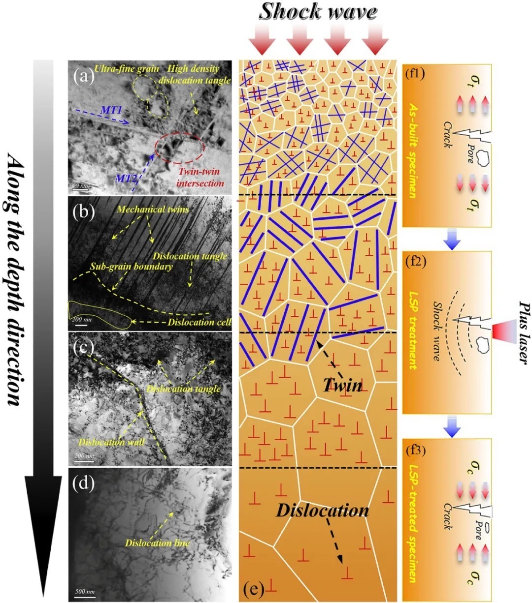LSP可以有效的消除表面的拉伸残余应力和诱导一个压应力在表层以下几个mm之下形成。在最近,Tong等人检查了LSP对DLD制造的CoCrFeMnNi HEA的显微组织、残余应力状态和机械性能的影响。LSP可以有效的闭合表面层的气孔和改变残余应力状态,从拉伸应力变为压应力。五个LSP的冲击制造出一个梯度的显微组织,这一显微组织在上部表面的超细晶粒过渡到高密度的位错结构和次表面中的机械孪生,最后在基底中形成几个位错线,见下图5所示。气孔的闭合和表面自残余拉应力向残余压缩应力的转变对提高材料的机械性能至关重要。LSP工艺对DLD打印的CoCrFeMnNi HEA的屈服强度,极限拉伸强度和延伸率分别提高33.3 %, 7.3 %和 15.13 %。